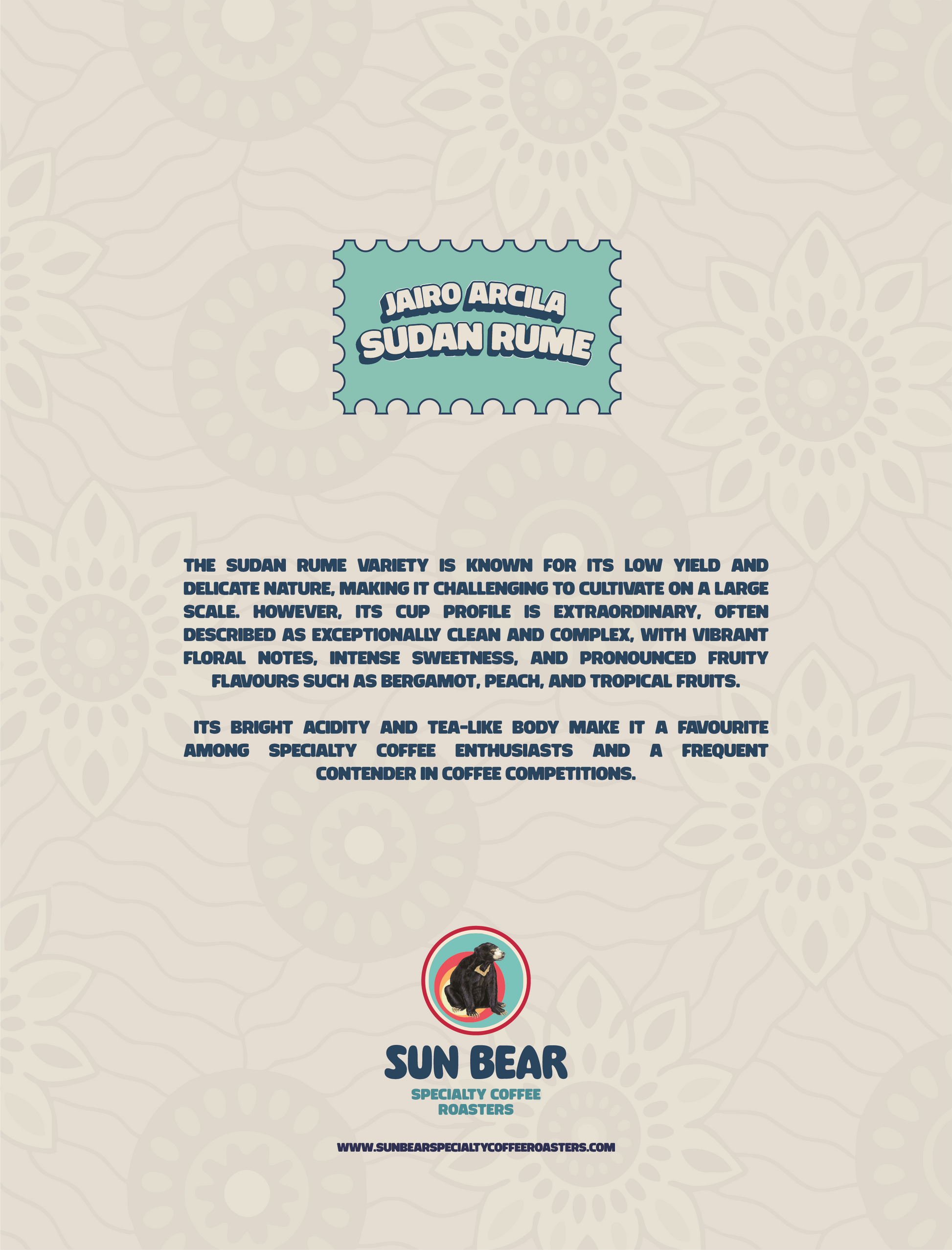Sudan Rume is a rare coffee variety from the Boma Plateau in South Sudan, near Ethiopia. Known for its natural genetic diversity, it offers a clean, complex cup with vibrant floral notes and fruity flavors like bergamot, peach, and tropical fruits. Despite its low yield and delicate cultivation, Sudan Rume stands out for its bright acidity and tea-like body, making it highly valued by specialty coffee experts and competition judges.